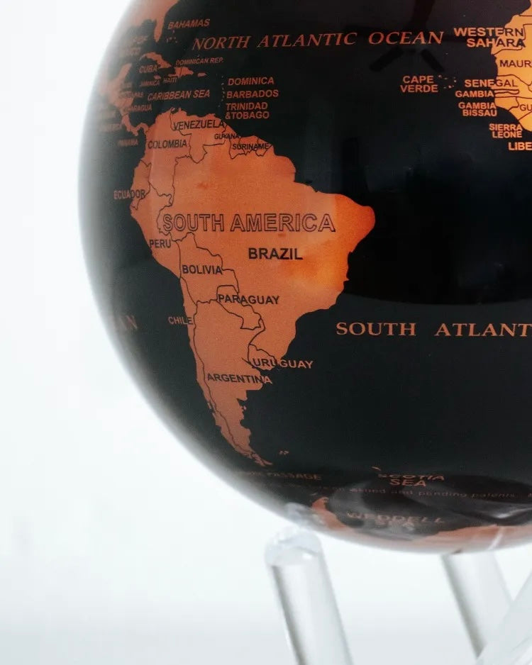 Schon auf den ersten Blick werden Sie von der geheimnisvollen Anziehungskraft dieses Globus fasziniert sein. Der Farbton des Wassers fängt die geheimnisvolle Dunkelheit der Ozeane ein. Kupferfarbene Landmassen erzeugen einen starken Kontrast, der den dramatischen Eindruck noch verstärkt. Dieses Stück eignet sich gut für eine Vielzahl von Inneneinrichtungen – von modern bis klassisch.