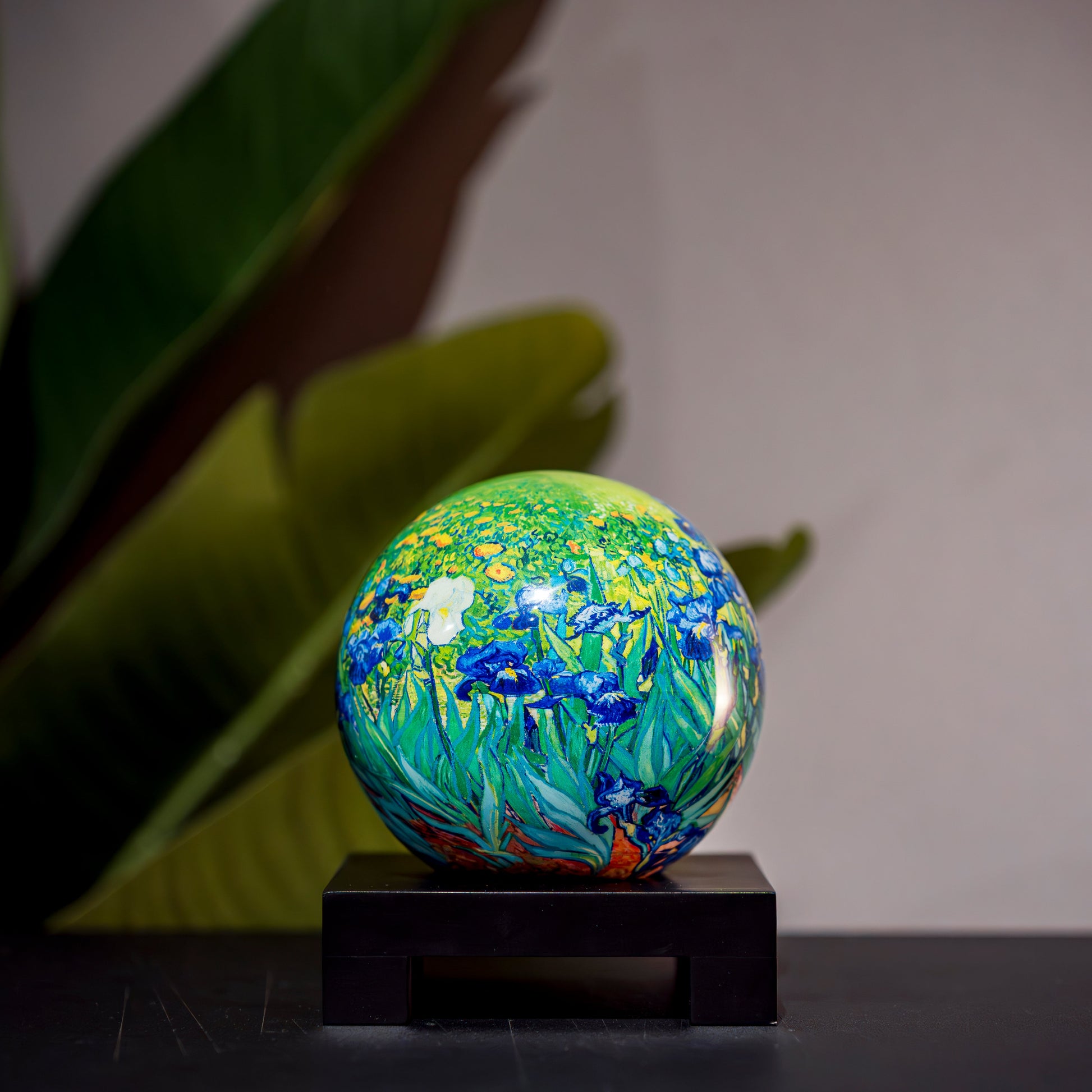 „Iris“ entstand in Van Goghs letztem Lebensjahr in einer Irrenanstalt und hat Kunstliebhaber über Generationen hinweg fasziniert. Das Bild ist schon auf Leinwand atemberaubend, aber auf unseren Globen verleiht es ihm eine neue Tiefe. Große Schwertlilien stehen im Mittelpunkt, wobei weiße Schwertlilien einen starken Kontrast zu den violetten Blüten um sie herum bilden. Gelbe Wildblumen erstrecken sich bis zum Horizont und lassen die Schwertlilien noch mehr hervorstechen.